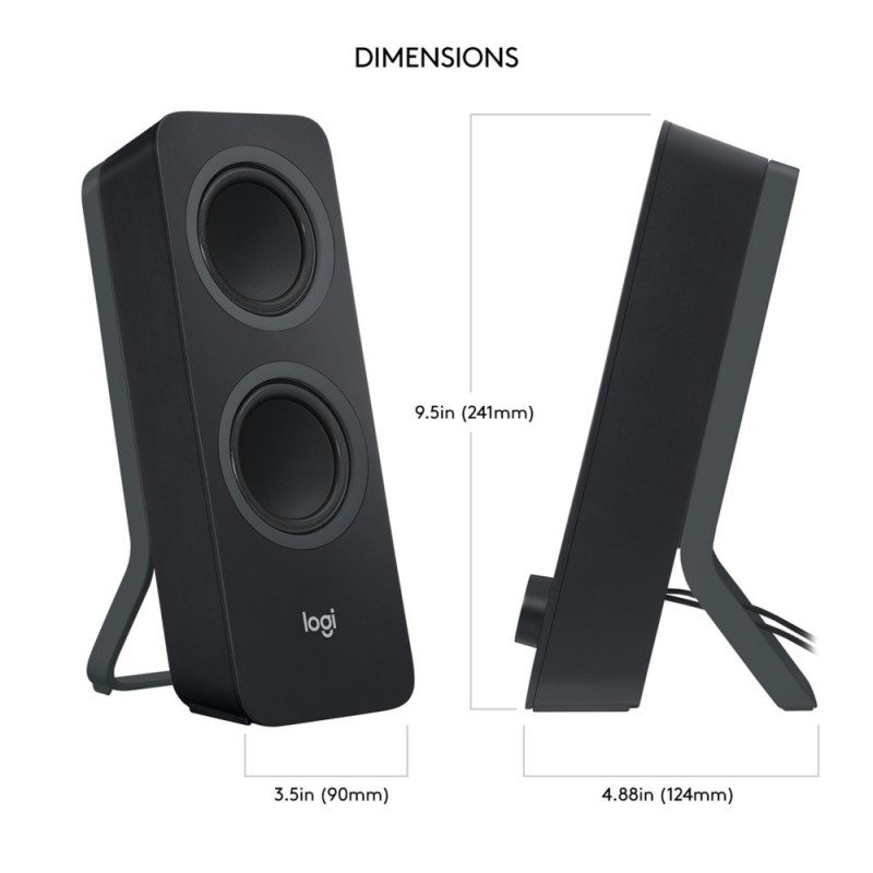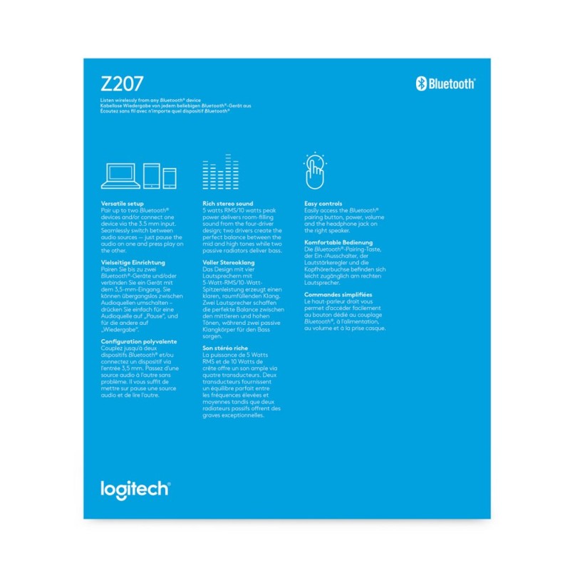 Logitech® Z207 Bluetooth® Computer Speakers bieden 10 watt piekvermogen/5 watt RMS voor rijk stereogeluid aan je bureau. Elke speaker heeft één actieve/aangedreven driver die het volledige geluidsbereik levert, en één passieve radiator voor een groter bassbereik. Stream draadloos audio via twee Bluetooth-apparaten of verbind één apparaat via de 3,5mm-ingang. Met Easy-Switch™ van Logitech kun je naadloos schakelen tussen geluidsbronnen. Druk op de ene bron op pauze en speel het geluid af op de andere. Vooraan op de rechterspeaker kun je gemakkelijk bij de knop voor Bluetooth-koppeling, de Aan/uit- en volumeknoppen en de hoofdtelefoonaansluiting.